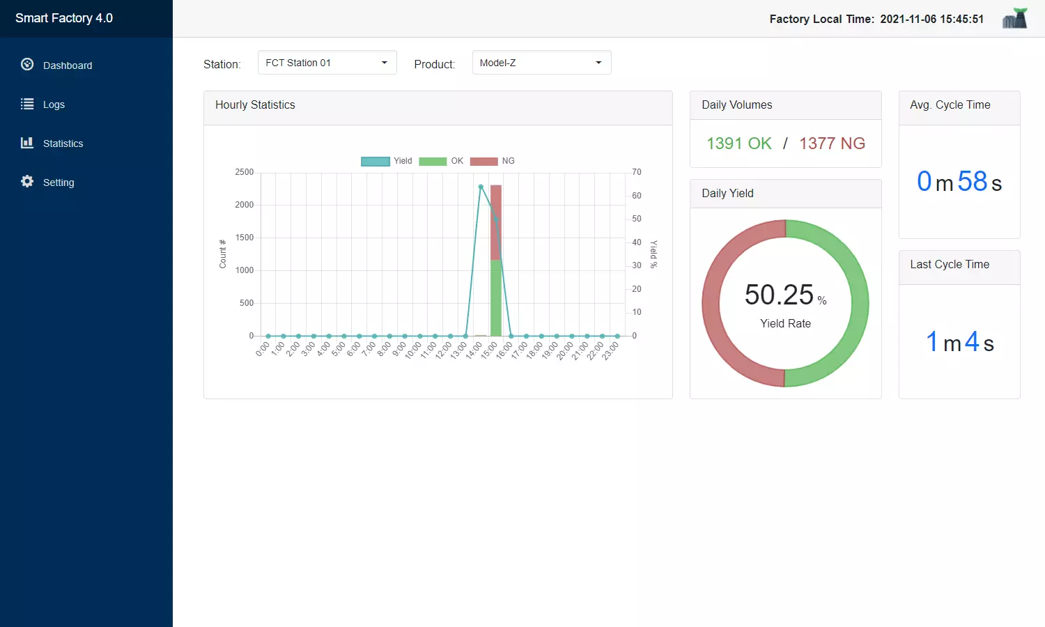 • Built Real-Time WebUI to show manufacturing statistics, e.g., UPH and yield rate. The system has process 120k units in the mass-production stage